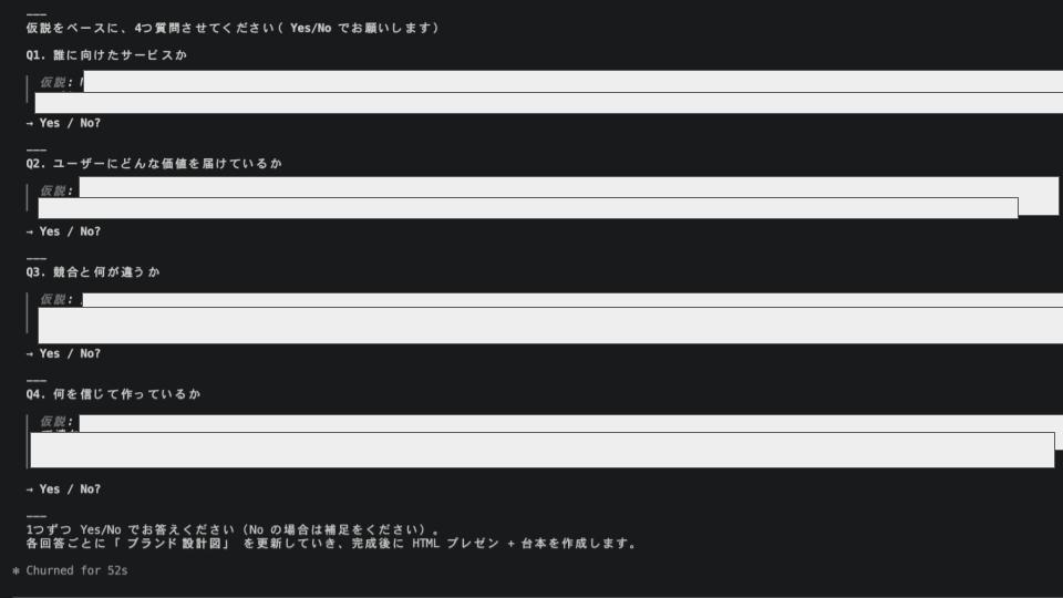そうすることでAIは「こういう人向けですよね?」「こういう価値を届けてますよね?」と仮説を立てて質問してくれるので、自分はYes/No で答えて、必要に応じて補足するだけ です。